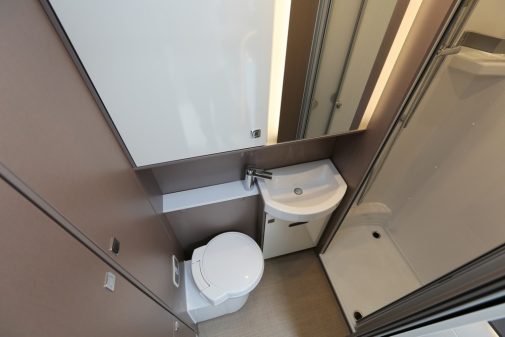 Si le salon occupe une place prépondérante dans l'implantation de ce profilé, Bürstner ne néglige aucunement le compartiment sanitaire. Au contraire. La partie arrière de la cellule est occupée par l’immense salle d’eau transversale. La cabine de douche, parfaitement séparée du cabinet de toilette, se montre très spacieuse et agréable à l’usage.