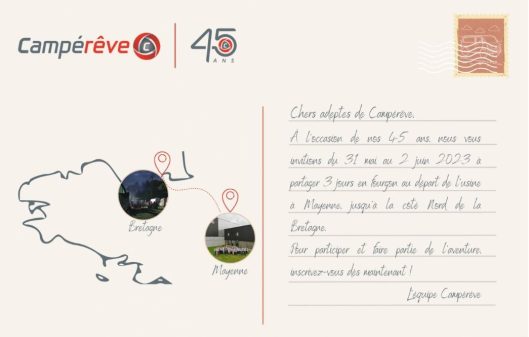 Pour la marque Campérêve, l'année 2023 a une saveur particulière puisqu'elle symbolise ses 45 ans d'existence. Et comme dans l'univers du véhicule de loisirs, les anniversaires ça se fête, la marque a décidé d'organiser trois jours de road-trip, du 31 mai au 2 juin, destinés uniquement à ses clients. Pour l'occasion, Campérêve organise un périple aux confins du nord de la Bretagne, en compagnie des équipes commerciale et technique du constructeur. À bord de votre fourgon Campérêve évidemment, embarquez pour un circuit spécialement pensé pour vous, ponctué d'une visite d'usine, d'activités et de diverses haltes dégustations. En revanche, seule une dizaine d'équipages sera retenue pour participer à ces 3 jours de festivités, mais également de réflexion.