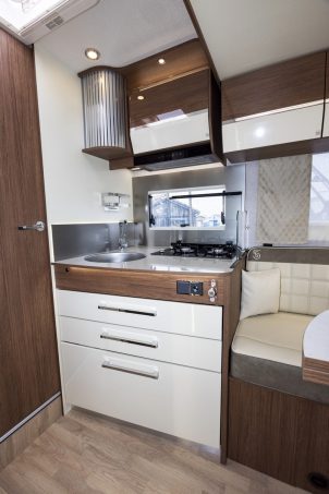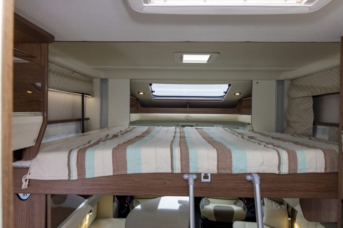 La cuisine installée dans la continuité de la banquette gauche (côté conducteur) affiche un design agréable. La profondeur de l'ameublement est à souligner. Cela permet de loger un réchaud deux feux affleurants ainsi qu'un évier tout en conservant deux plans de travail. Ce choix est également profitable aux rangements en partie basse dans les tiroirs. Dans le véhicule de l'essai, le coin repas est surmonté d'un lit de pavillon pour deux personnes avec un matelas de 128 x 187 cm. En revanche, malgré le caractère "édition spéciale", ce couchage supplémentaire est disponible en option au prix de 950 €. Dans la codification Fleurette, l'appellation LMF signifie (entre autre) que l'on dispose à bord d'un "Lit de Milieu", autrement dit central. Ce Magister bénéficie en effet en chambre arrière de ce type de literie avec un bon accès de part et d'autre du matelas. Ce dernier profite de cotes de 152 x 190 cm reposant sur un sommier réglable en hauteur... électriquement.