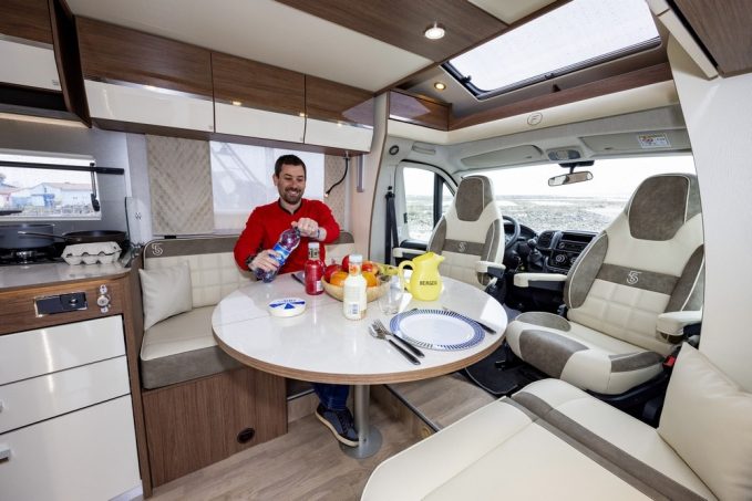 Avec ce profilé de 7,38 m de longueur, il n'y a pas de mauvaises surprises, le constructeur mettant parfaitement à profit la grandeur de la cellule. A commencer en partie avant par un vaste salon "lounge" composée des banquettes en vis-à-vis associées aux sièges pivotants du porteur. L'ensemble se destine à un usage pour quatre personnes dans un confort tout à fait appréciable. Il faut dire que pour les besoins de cette série spéciale, Fleurette a souhaité afficher une sellerie haut de gamme dite EmoCuir, élégante par ses surpiqûres "55" rappelant l'édition anniversaire à laquelle ce profilé appartient. De plus la luminosité est de mise grâce à la teinte du mobilier mais surtout par la présence de série du skyroof dans la casquette.
