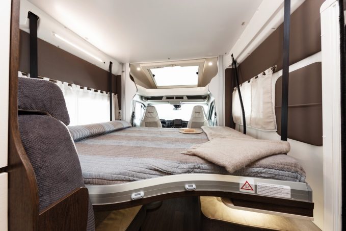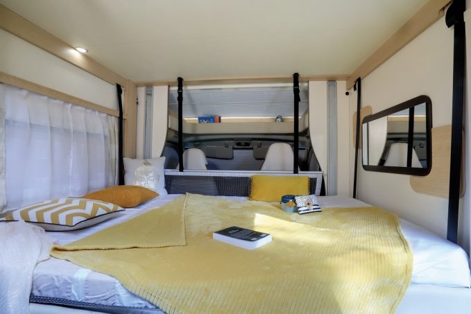 Dans le catalogue Benimar, l’entrée de gamme Tessoro propose trois modèles sans lit au plancher : le T488, le T483 et le T481. Nous avons retenu ce dernier, parce que son gabarit est le plus court des trois. Par sa longueur raisonnable de 5,99 m, le Tessoro T481 peut sans problème rivaliser avec n’importe quel fourgon aménagé. Il est par ailleurs avantagé par sa largeur de 2,30 m, plus importante que celle d’un tôlé, ce qui facilite l’installation en transversal du lit de pavillon aux dimensions généreuses. Ainsi, le matelas mesure 191 x 140 cm. Il est biseauté au pied. Abaisser et relever le lit de pavillon ne nécessite rien de plus que d’appuyer sur un interrupteur. Il est possible d’interrompre sa course à mi-hauteur pour laisser suffisamment d’espace en dessous, lorsque la dînette est convertie en couchage, par exemple. Benimar propose de série quatre places nuit sur ce profilé compact. Le salon se transforme donc en un vaste couchage. Si les dimensions de ce lit d’appoint sont plus importantes que celles du couchage haut (140 x 210 cm), son confort est un peu plus sommaire, par un assemblage des coussins et l’absence de sommier à lattes…