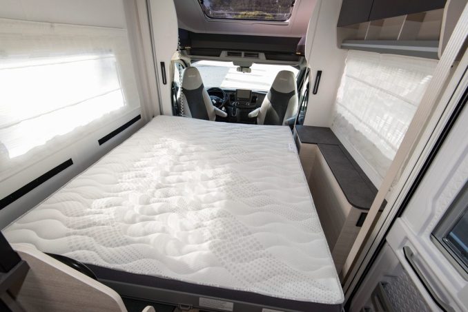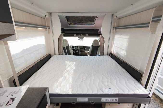 Le soir venu, ce coin repas se transforme en une belle chambre. Il suffit pour cela d’abaisser le lit en pavillon. La manœuvre est simple : il suffit d’actionner le moteur électrique en appuyant sur un interrupteur. Le couchage principal est composé d’un matelas de 160 x 190 cm qui repose sur un sommier à lattes. Il s’agit là du lit le plus large existant parmi ceux présentés dans cette thématique. Un deuxième couchage est disponible en partie basse, après la conversion – simple, elle aussi – du coin repas. Ce lit de dînette affiche des dimensions de 135 x 195 cm. Ces deux couchages empêchent l'utilisation du salon.