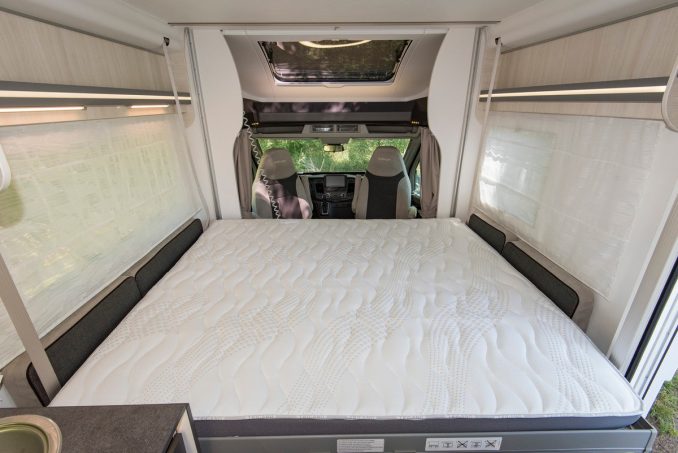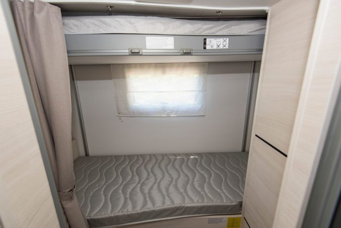 Il vient ainsi en complément du lit de pavillon électrique qui offre deux couchages supplémentaires, de 160 x 190 cm. A l'arrière de la cellule, on retrouve des lits superposés, mais... pas comme les autres : le couchage inférieur est sur un sommier "fixe", avec la possibilité toutefois de le régler en hauteur pour augmenter le volume en soute. Le couchage supérieur est en revanche rangé "au plafond". C'est un lit de pavillon avec un système électrique pour le positionner à la hauteur souhaitée.