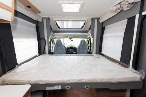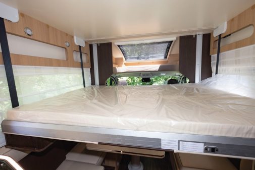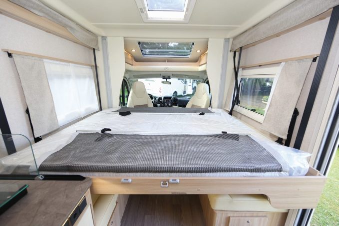 Sitôt monté à bord, on arrive dans un vaste salon constitué de longues banquettes latérales en vis-à-vis. Ces jolis canapés peuvent confortablement accueillir quatre personnes. Les sièges pivotants du poste de conduite peuvent en recevoir deux autres. Cette grande dînette est convertible en couchage double de 210 x 120 cm. Il s’agit là d’un lit d’appoint qui vient en complément du couchage principal plaqué contre le pavillon. Ce dernier, équipé d’un moteur électrique pour l’abaisser et le remonter, est doté d’un matelas de 200 x 150 cm, posé sur un sommier à lattes.