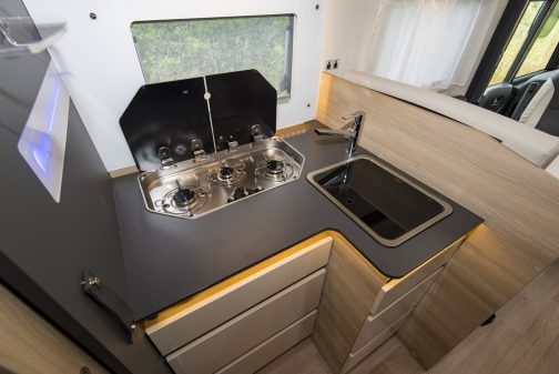 Le plan de travail bien dimensionné accueille pour sa part un réchaud deux feux et un évier rectangulaire. Un grand frigo vient compléter l'équipement de base. Pour la partie sanitaire, cet intégral bénéficie d'un poste en deux parties avec d'un côté un cabinet de toilette et de l'autre une douche indépendante. Les deux espaces distincts peuvent toutefois être réunis en un seul.