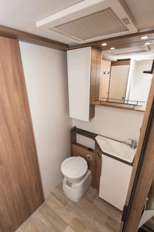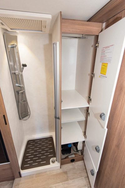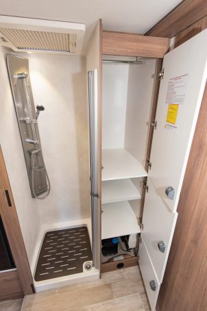 Positionnée juste derrière le poste de conduite, une vaste salle d’eau occupe toute la largeur de la cellule, en deux parties distinctes. Celle placée derrière le siège passager constitue le cabinet de toilette avec lavabo et WC. L’autre reçoit la cabine de douche. Un jeu de portes et de cloison coulissante permet de les réunir pour ne former qu’une pièce.
