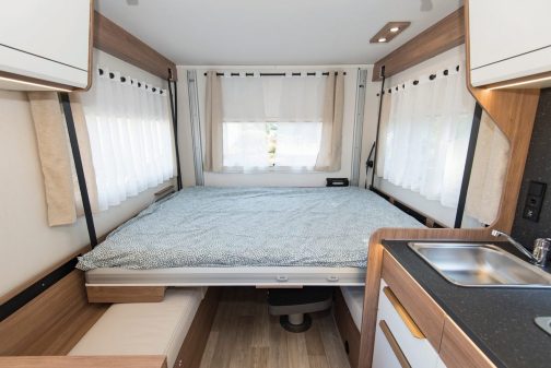D’autant plus que cette grande dînette peut être transformée en couchage king size double de 160 x 200 cm… d’appoint ! Car le “véritable” lit est celui plaqué contre le pavillon, au-dessus du salon. Animé par un moteur électrique, on peut l’abaisser et le remonter en appuyant simplement son pouce sur un connecteur. Une fois en place, on dispose d’un matelas en mousse haute résilience de 160 x 200 cm, posé sur un bon sommier à lattes, plus confortable que l’enchevêtrement de coussins du couchage d’appoint.