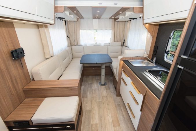 On y trouve une vaste et lumineuse dînette qui permet aux 7 voire 8 convives confortablement installés de profiter d’une vue panoramique sur l’extérieur. De plus, ce coin repas respire la convivialité et invite au partage. On y prend ses repas, bien sûr, mais on y joue aussi, aux cartes, aux dés ou avec un jeu de plateau… Bref, ce salon est véritablement l’atout séduction de ce profilé.
