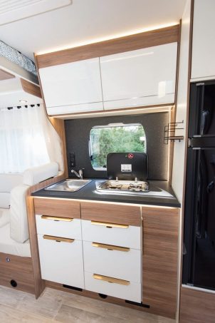La cuisine fait face à la porte d’entrée. Elle compte un grand nombre de rangements, dont d’amples tiroirs où l’on peut entreposer casseroles, poêles et vaisselle. Le réfrigérateur attenant au bloc-cuisine offre un volume de 153 l, y compris un congélateur indépendant.
