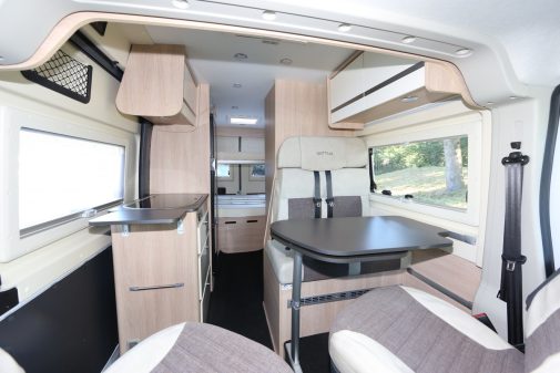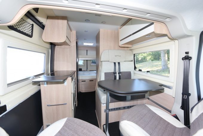 Le petit 54T (5,40 m), les 60T et 60B, ce dernier avec couchages superposés, sont disponibles à moins de 53 000 €, quand ils sont fabriqués à partir du Citroën Jumper (seul le 54T reste sous cette somme lorsqu’il est gréé sur le Fiat Ducato). Bonne nouvelle, malgré leur prix léger, ces fourgons aménagés respirent la qualité et ne manquent absolument pas de charme. L’ambiance est soignée et chaleureuse. Ils partagent la même dînette constituée d’une banquette face route, des sièges de cabine sur embase tournante et d’une table munie d’une rallonge pivotante. La salle d’eau du 60B dispose d’une vasque articulée tandis que celle du 60T est équipée d’une douche séparée (rare dans les fourgons).