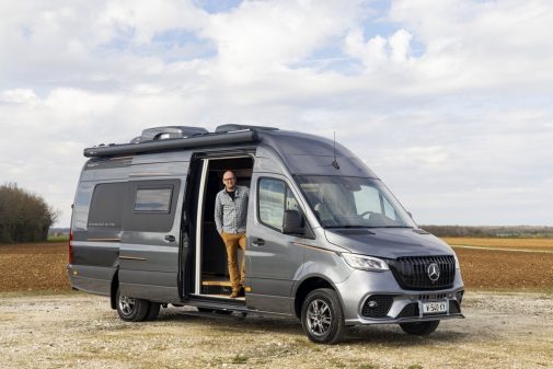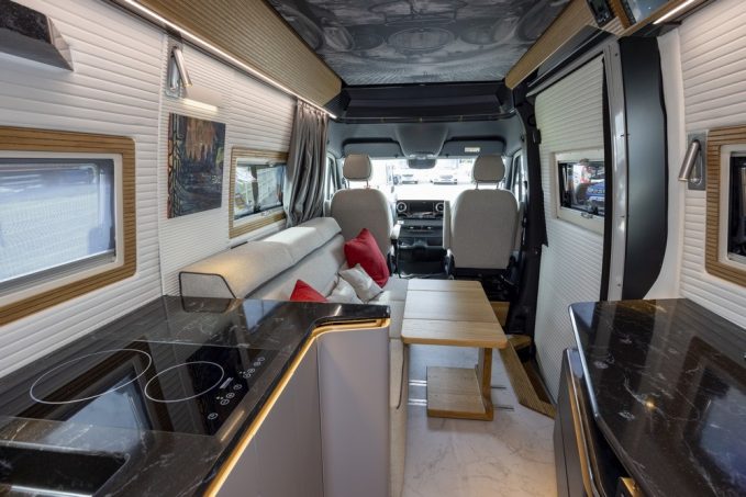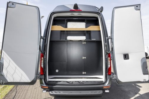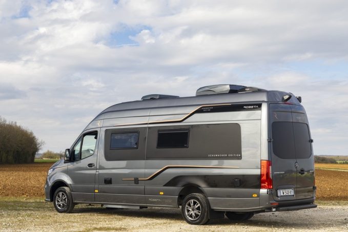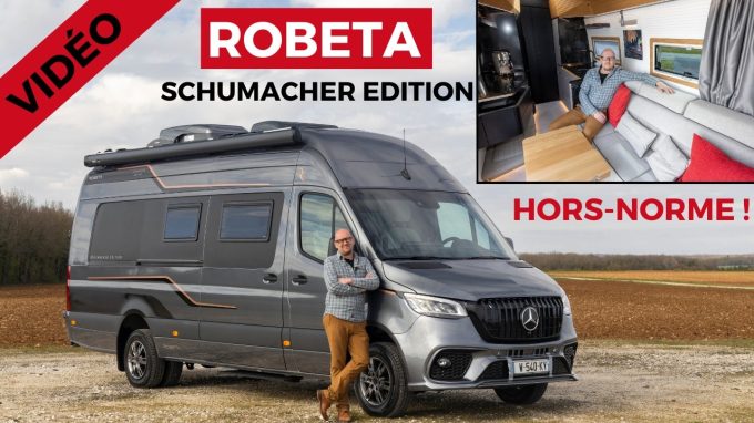 Robeta, marque slovène proposant de très beaux fourgons aux ambiances léchées et aux nombreuses possibilités de personnalisation, arrive en France avec ses Apollo, Ares, Dyonisus, Helios, Kronos et Adonis, ce dernier reposant sur la base du Mercedes Sprinter, tout comme… le Schumacher Edition du nom de l’ancien pilote de Formule 1 et de DTM Ralf, frère de Mickaël. Ce fourgon est déjà impressionnant de l’extérieur par ses dimensions (7,37 m de long, 2,83 m de haut), sa masse (un poids lourd) et son bouclier avant plutôt agressif.