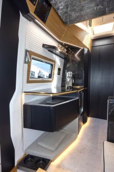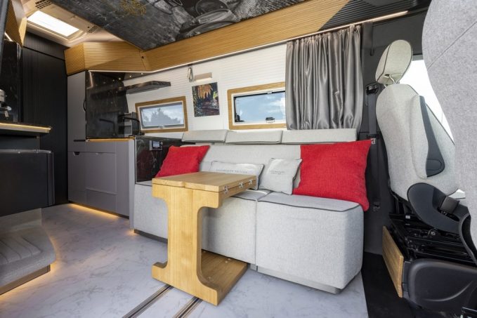 A bord, on trouve plutôt une ambiance cocooning avec un espace salon particulièrement accueillant avec son immense sofa longitudinal et sa table basse en bois coulissante. Au plafond, se trouve le lit de pavillon à commande électrique. Aussi étonnant que cela puisse paraître, c'est le seul couchage de cet incroyable véhicule, et ce, malgré son imposant gabarit, pour deux. Enfin un programme en couple avec... un chien qui a droit à son espace personnel sous le meuble de cuisine.
