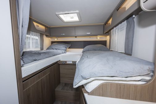 Le T338 Edition 24 reprend à l'identique l'implantation du T338 existant déjà sur Fiat depuis de nombreuses saisons. On ne change pas une recette gagnante, on l'améliore ! A bord, les évolutions concernent l'aspect esthétique avec un nouveau mobilier (décor et lignes). Ce T338 embarque en chambre arrière, des lits jumeaux de dimensions généreuses (80 x 192 et 200 cm) qui reposent sur une vaste soute garage. Si de prime abord ces couchages sont pensés de manière indépendante, il sera facilement possible de les réunir en un grand lit XXL, grâce à une rallonge centrale (prévue... en option).