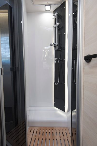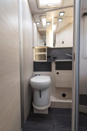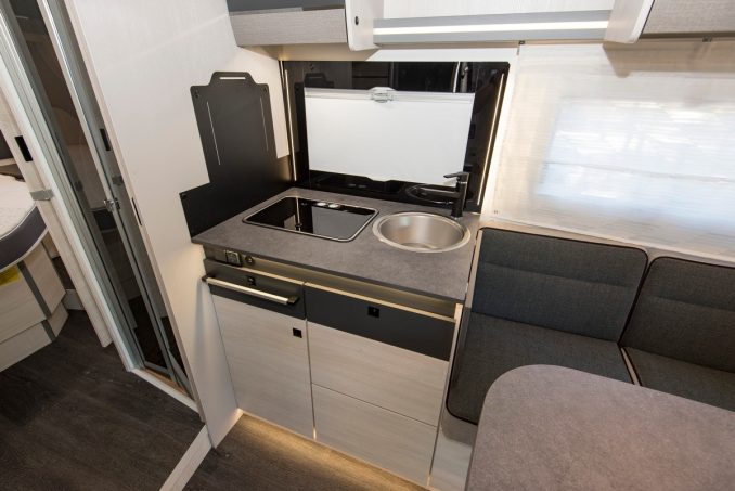 La cuisine, fonctionnelle, se pare d’un réchaud deux feux et d’un évier inox. Les rangements sont nombreux et un grand frigo de 141 l s’ajoute pour compléter l’espace repas. A noter la petite tablette amovible le long du mobilier qui peut étendre la surface de travail. En revanche, elle empiète légèrement sur la banquette du salon.