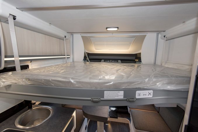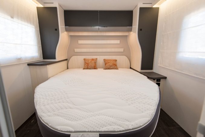 En chambre arrière, ce profilé Chausson 788 accueille un vaste lit central aux dimensions généreuses de 160 x 190 cm. La largeur est obtenue grâce aux galbes des penderies qui ceinturent le sommier. De série ce profilé Chausson bénéficie d’un système manuel qui permet de relever la literie d’une trentaine de centimètre au profit de la hauteur en soute.