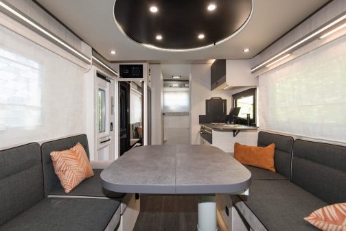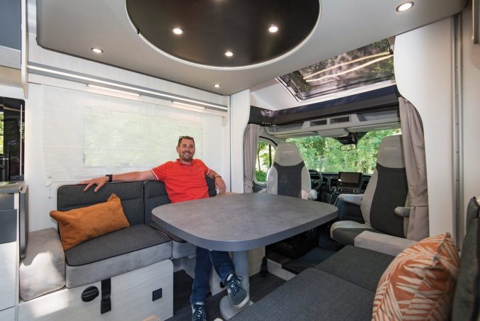 La tendance forte sur le marché du véhicule de loisirs, c’est l’utilisation du salon face-face. Mais comme nous le disions en préambule de ce dossier, l’avènement de ces banquettes en vis-à-vis a contraint les marques à réduire leur programme à quatre places carte grise, n’autorisant plus que deux passagers à voyager à l’arrière… Une généralité qui a son exception avec le 380 chez Challenger. En effet, ce véhicule est un des rares modèles à bénéficier d’un salon lounge avec trois places homologuées carte grise qui viennent en complément des deux sièges de cabine.