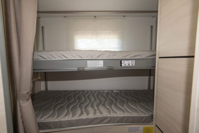 Au-delà de cette donnée inscrite sur le certificat d’immatriculation, le 380 étonne également par son implantation originale. Une manière de sortir habilement des sentiers battus avec notamment une partie arrière consacrée à la chambre des enfants (ou d’ado) avec un couchage simple transversal (81 x 200 cm) secondé par un lit de pavillon électrique (74 x 190 cm).