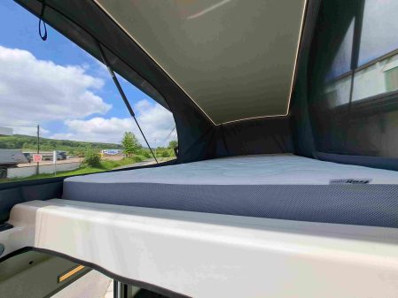 Ce toit s’actionne facilement grâce à un système de pantographes. La toile reçoit trois larges ouvertures avec zip et moustiquaire qui permettent de ventiler la chambre. Le lit, sous ce toit, est composé d’un matelas Froli intégrant de la mousse froide et des plaques à ressorts. Cette combinaison apporte un très bon confort aux deux personnes qui y prendront place. D’autant plus que les dimensions sont suffisamment importantes (230 x 120 cm) pour ne pas gêner sa voisine ou son voisin.