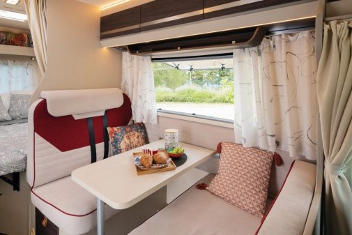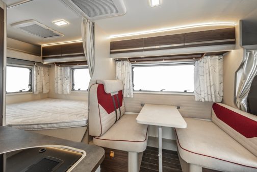 S’inspirant de l’univers de la capucine, catégorie où excelle la marque, Rimor loge une dînette avec banquettes en vis-à-vis offrant des assises face et dos à la route. Cette composition offre la possibilité d’accueillir quatre passagers à l’arrière, qui voyageront en vis-à-vis. Ce coin repas se transforme en couchage de 124 x 188 cm à l’étape et peut accueillir deux personnes. Enfin, la version Plus signifie que ce profilé embarque, de série, un couchage en pavillon électrique de 138 x 200 cm. En revanche, force est de reconnaître que ce Seal 12 Plus dans un usage maxi avec six personnes à bord demande évidemment une excellente organisation.
