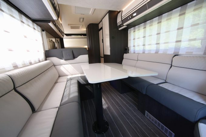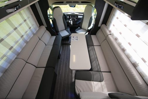 Ce modèle se distingue également par son salon démesuré. Avec de vastes banquettes et un canapé, il revendique la possibilité d’accueillir six personnes autour de la table sans avoir à se serrer ou utiliser les sièges pivotants du poste de conduite, à disposition. De série, une partie de cette dînette peut se convertir en couchage simple avec des dimensions de 63 x 187 cm.
