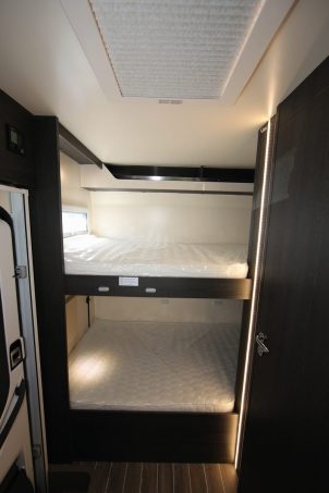 Des plans comme le Kronos Go 274 TL, il n’en existe pas beaucoup. En effet, ce modèle reprend le plan des capucines avec, en partie arrière, des lits superposés aux dimensions très généreuses. Le profilé italien abrite des matelas de 100 x 216 cm chacun. Une largeur sans nul doute la plus importante du marché pour des lits simples. Cette chambre semble s’adresser, en toute logique, à des enfants ou des ados, mais force est de reconnaître qu’une telle dimension de sommier autorise aisément des adultes à y prendre place. Le couchage en partie basse peut, si besoin, se relever pour augmenter le volume de la soute.