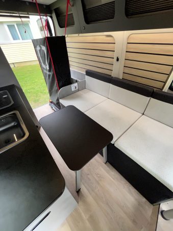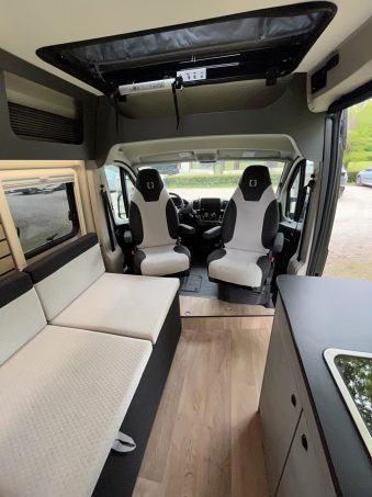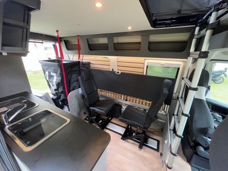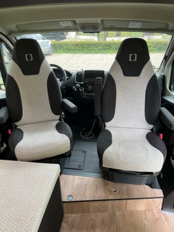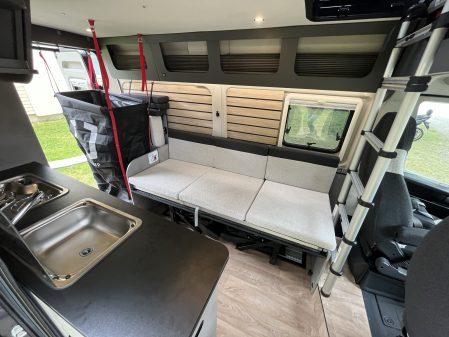 Derrière les sièges de cabine pivotants, un large sofa s’alanguit contre la paroi gauche. Ce dernier se transforme en lit grâce à des sommiers peigne, mais peut également s’escamoter et découvrir deux sièges route pliants qui se positionnent face-face (celui de l’avant étant installé dos à la route). Ils sont également amovibles. Les deux sont proposés en option (1 200 euros l'unité).