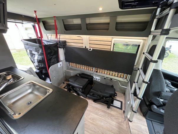 A l’arrière, un espace est réservé à une douche chaussette (receveur à enficher dans l’évacuation au plancher et rideau fixé au pavillon) ou une penderie textile. Le côté droit est occupé par la cuisine à l’entrée, dont la partie évier, avec ses deux jerricans d’eau (10 l) peut être ôtée. Et un meuble colonne comprend le réfrigérateur.