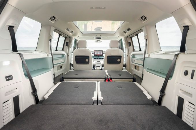 Dernier-né de la famille, l’ID.Buzz a empattement long offre plus de places mais aussi plus d’autonomie. En effet, 7 personnes peuvent prendre place à bord. Pour cela, il a fallu rallonger le véhicule d’environ 25 centimètres pour donner la longueur suivante : 4.96 mètres.