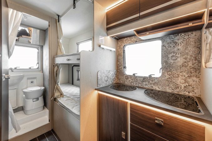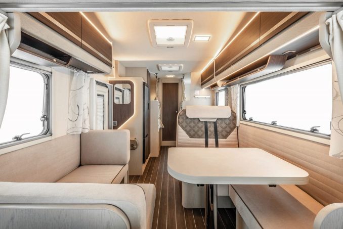 Pour la convivialité à bord, direction le salon. Cette capucine embarque en effet un vaste living avec deux banquettes en L. Cette disposition autorise les six passagers à prendre place aisément autour de la table. La cuisine occupe un petit espace au milieu de cette implantation, tout en maîtrise. Sans être démesurée, elle est fonctionnelle avec, notamment, la présence d’un grand frigo de 142 l – capacité primordiale pour un usage à six.