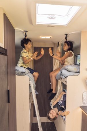 Sans conteste, la capucine Seal 50 est le plus original des véhicules familiaux du marché et de ce dossier. Dans ce modèle de 7,34 m de long, Rimor a en effet installé, en partie arrière, un véritable dortoir avec non pas deux couchettes superposées, mais… quatre. Chacune dispose d’un matelas de 71 x 200 cm. Ces lits – positionnés dans le sens de la longueur, sur les deux flancs du véhicule – sont séparés au centre par la salle d’eau contre le panneau arrière.