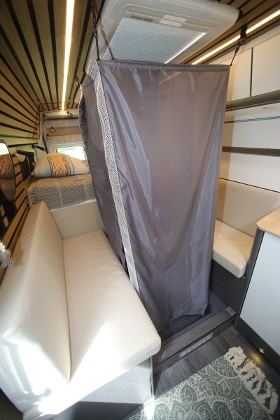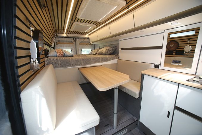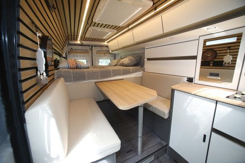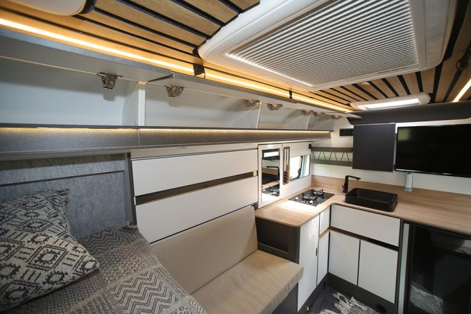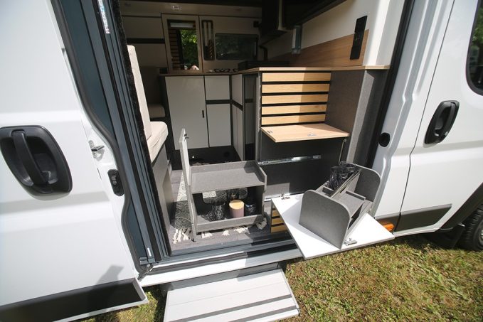 Weinsberg a déjà à son catalogue des produits atypiques, tels des profilés étroits ou le Outlaw à garage étanche. Mais ce tout nouveau CaraLife casse clairement les codes du produit industriel en prenant son inspiration du côté des petits aménageurs, voire des amateurs. Ce véhicule à l’esprit particulièrement jeune se caractérise en premier lieu une cabine, à trois places séparée, de la partie habitation. Derrière la cloison de séparation se loge une partie de la grande cuisine en L. A l’entrée, le meuble intègre des rangements coulissants et rabattables, parfait pour des apéros à l’extérieur. Le salon est composé de deux vastes sofas disposés face à face, dans la longueur et encadrant une table escamotable qui, une fois stockée, laisse la place pour une douche-chaussette avec bac intégré sous le plancher, bac qui sert aussi de remise pour le rideau.