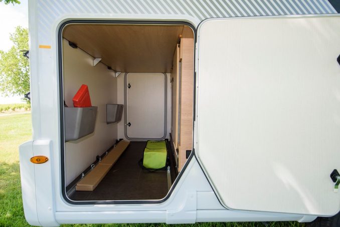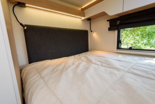 La partie arrière de la cellule est occupée par un lit transversal assez haut perché pour obtenir une soute volumineuse dans laquelle on peut facilement embarquer des vélos, un paddle, des skis, voire un scooter…
