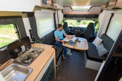 Le Qwest Q696G abrite un salon face-face surmonté, en option, d’un lit de pavillon. Pour se démarquer, Bavaria a sélectionné la finition Trail du Ford Transit pour se démarquer et apporter un petit côté baroudeur, très sympathique.