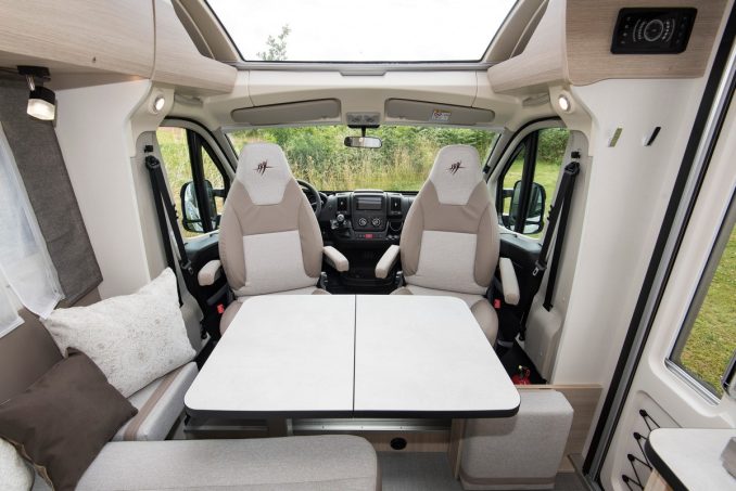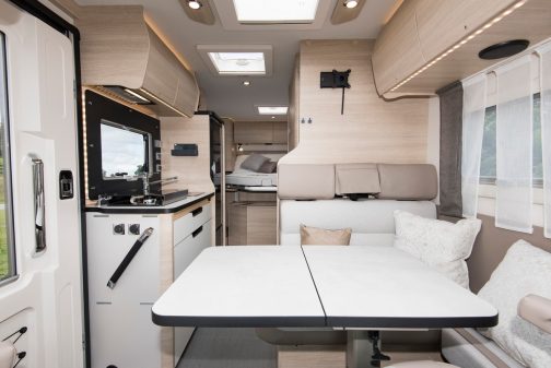 A l’avant de la cellule d’abord, le salon plutôt spacieux présente une banquette en L qui permet d’héberger plus de convives autour de la table. La table peut se rabattre pour plus d’espace. L'ensemble est surmonté d'un vaste skyroof en verre galbé qui offre une belle luminosité sur ce poste. En prime, ce toit dôme permet d'affiner la ligne extérieure du véhicule.