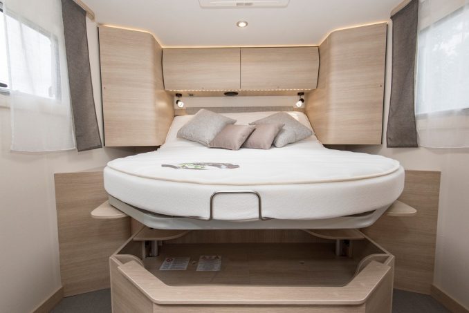 A l’arrière de la cabine, le coin chambre. On y découvre un lit central de belles dimensions, 140 x 190 cm. Ce dernier dispose d’une tête relevable afin de disposer de plus d’espace au niveau des pieds. Le sommier peut se parer en option d'un système électrique qui permet de relever le sommier d'une trentaine de centimètre et par conséquent 30 cm de hauteur en plus en soute.