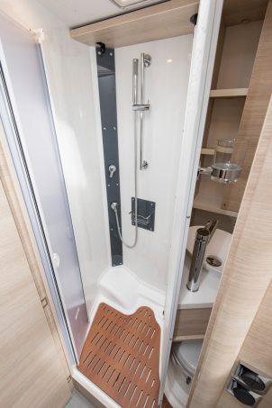 La salle d’eau, bénéficie d’un système vario qui permet une belle optimisation du cabinet de toilette grâce à une simple paroi pivotante. On passe donc rapidement et facilement d'un compartiment toilettes avec lavabo et WC à une vaste douche isolée. A noter que le caillebotis est fourni de série.