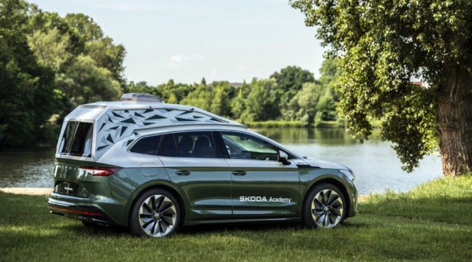 En prenant le modèle de base Skoda Enyaq, les étudiants de la Skoda Academy ont d’abord pensé à modifier la carrosserie. En effet, on découvre une nouvelle structure de toit et un nouveau hayon. Les dimensions, quant à elles, restent inchangées : L 4,65 x l 1,88 m. Seules les dimensions en hauteur ont été modifiées, avec un ajout de 35 cm pour gagner en volume sur l’arrière de la cellule.