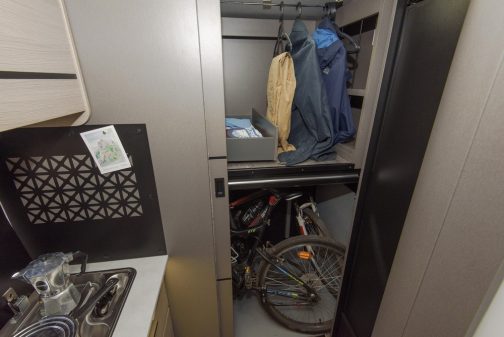 Mais en appuyant sur un bouton sous la plan de travail de la cuisine, on s'aperçoit que le plancher de ce vestiaire peut remonter électriquement jusqu'à mi-hauteur. Il se transforme alors en simple dressing, et dévoile une soute garage grâce au volume inférieur dégagé. Le X650 revendique le fait de pouvoir embarquer à bord deux vélos dans un compartiment étanche et surtout à l'abri des regards. Mais plus que des mots, vous pouvez découvrir une fois encore la vidéo sur notre chaîne YouTube. Ce X650 n'est proposé cette saison qu'en finition Exclusive Line avec un niveau d'équipement standard comprenant notamment la clim cabine, la porte cellule avec moustiquaire et baie, le skyroof ouvrant dans la casquette de profilé, les feux diurnes à LED ou encore les jantes 16" pour le côté sportif. Cette nouveauté affiche un prix à partir de 74 990 € avec la motorisation 2.2 l de 140 ch.