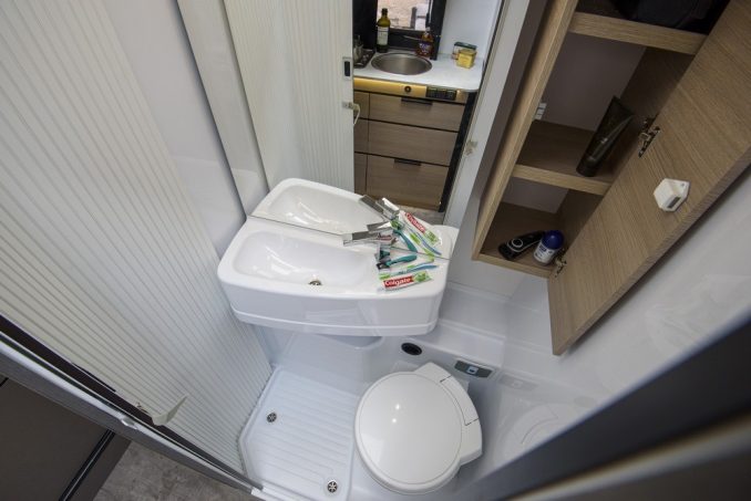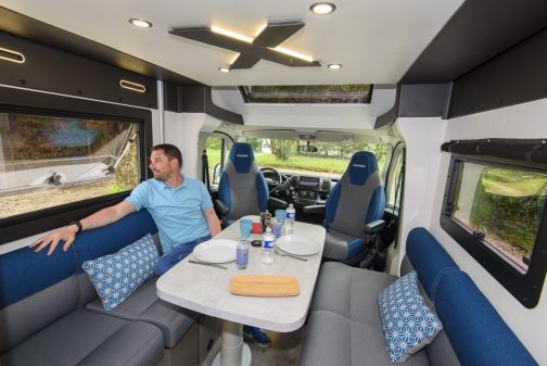 Le X650 affiche 6,36 m de longueur, 2,10 m de largeur et pour finir 2,75 m. Pour autant, dans l'habitacle, la comparaison avec un fourgon s'arrête là. Ce X650 mise sur un salon face/face convivial et étonnement spacieux compte tenu de la largeur intérieure sous la barre des 2 m. Chausson mise ici sur un poste tendance dont la disposition est également propice aux déplacements. En partie supérieure, ce modèle abrite un lit de pavillon de 140 x 190 cm. Il s'agit ici du couchage principal mais peut être toutefois superposé à la dînette convertible. Au niveau du poste sanitaire, ce X650 reçoit une salle d'eau "Vario" avec une paroi pivotante. On passe ainsi d'un cabinet de toilette à une douche isolée, rapidement et simplement. Ce profilé embarque par ailleurs des réserves d'eau propre et d'eaux usées de 100 l chacune.