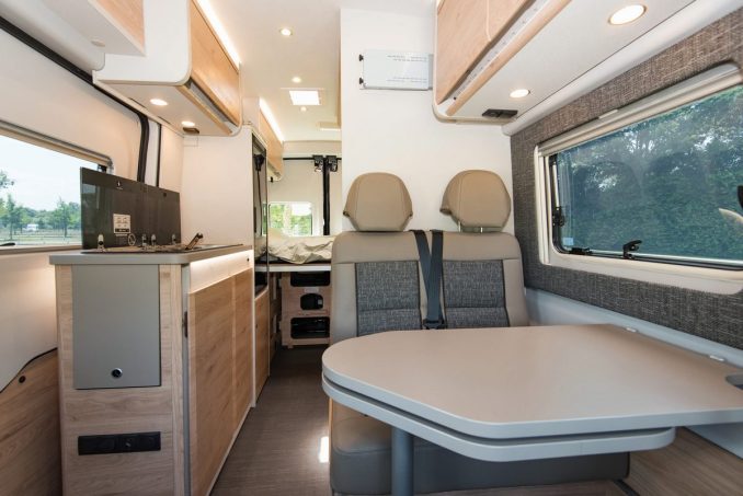 Le Miramar 61 est le dernier-né de la marque Campérêve. En utilisant pour la première fois le Ford Transit, le constructeur mayennais a ressorti des cartons une appellation déjà employée par le passé, mais avec un modèle en Renault Master. L’implantation du Miramar 61 est directement inspirée de celle du Magellan 641. Son lit transversal est constitué d’un sommier peigne coulissant qui permet de libérer du volume à l’arrière. Il est alors possible d’entreposer un vélo sans avoir à démonter ses roues. La salle d’eau modulable se transforme en cabinet de toilette ou en cabine de douche en faisant pivoter une paroi.