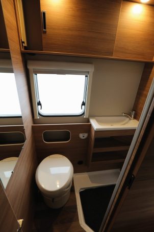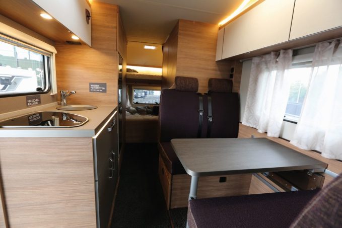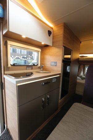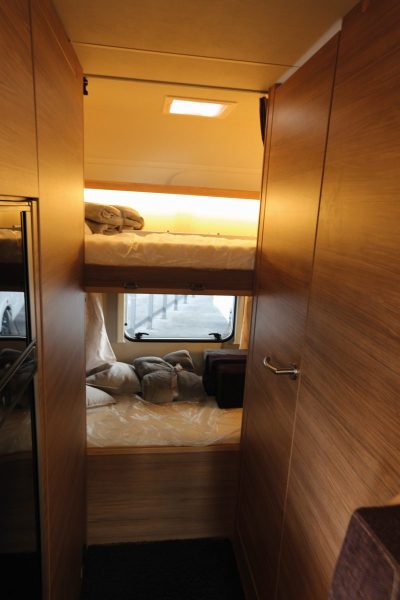 L’agencement de la capucine CaraHome 600 DKG du constructeur allemand Weinsberg (groupe Knaus Tabbert) a été développé pour accueillir six personnes, dans une cellule de seulement 6,45 m de long. L’implantation reste relativement conventionnelle avec des lits superposés en partie arrière, aux dimensions différentes, mais généreuses : 76 x 211 cm pour le couchage inférieur et 76 x 194 cm pour celui logé en partie supérieure. Un lit double est intégré dans la capucine avec, le concernant, des dimensions de 140 x 210 cm. Transformer la dînette en lit permet de disposer de deux places nuit supplémentaires. On obtient ainsi un lit de 100 x 184 cm, des cotes qui conviendront davantage à des enfants.