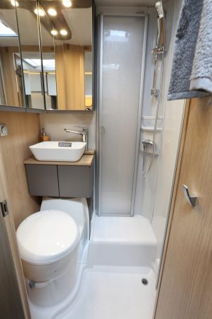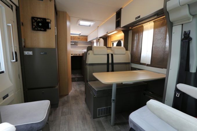 Au niveau du salon, ce poste est prévu pour recevoir cinq personnes. En effet, outre les sièges de la cabine et la banquette face route, ce profilé mise sur un strapontin coulissant au niveau de la porte cellule qui conviendra temporairement à un cinquième convive. La salle d’eau est spacieuse et propose ainsi une vaste douche séparée par des portes à battants. Pour l’heure, aucun prix n’a été communiqué. Mais d’après nos estimations, le Tourer Lift H664G pourrait être commercialisé aux environs de 85 000 €.
