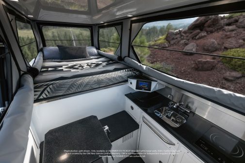 La cellule qui s'intègre parfaitement avec le véhicule, a été construite en fibre de carbone. Elle est dotée d'un toit "pop-up" qui permet alors d'obtenir une hauteur intérieure de 2 mètres. À l'intérieur, on trouve une cuisine avec évier et plaque à induction, un espace toilette et douche et évidemment, un couchage deux places surélevé. De nombreux rangements accessibles depuis l'intérieur et depuis l'extérieur ont été imaginés. Le pick-up inclut même une réserve d'eau de 51 litres, elle aussi accessible depuis l'intérieur et l'extérieur. Le tout est contrôlé par un écran tactile permettant de gérer les différents éléments du camping-car.
