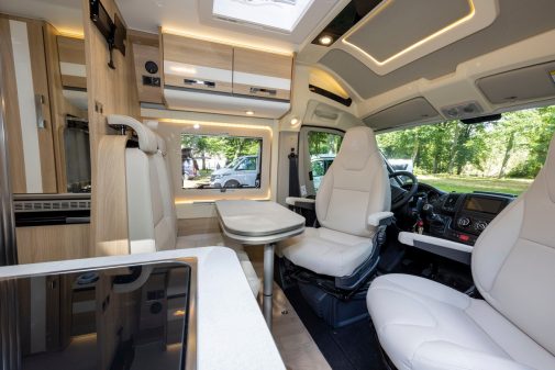 Ces deux modèles partagent donc la même implantation avec d'abord un beau salon ou quatre personnes peuvent s'installer grâce aux sièges avants pivotants et à la banquette face route pour deux personnes. A côté, le bloc cuisine se pare d'un réchaud deux feux, d'un évier en inox et de placards en partie haute et basse.