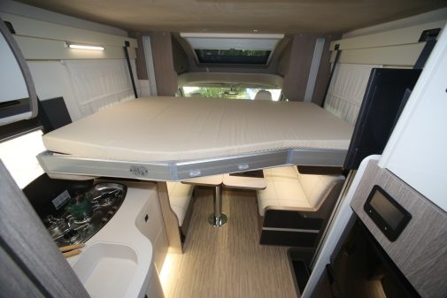 Le grand salon s’organise donc autour de deux sofas longitudinaux, cachant chacun un siège route, et se complète d’une table portefeuille et des sièges de cabine pivotant. La cuisine est plutôt bien pensée et dispose de trois feux. Une marche donne accès à l’espace nuit avec, à l’entrée, une salle d’eau répartie entre les deux côtés. Les deux espaces sont joignables et isolable du reste de la cellule grâce à une porte à double chambranle (celle du cabinet de toilette, La douche se fermant grâce à une paroi repliable fumée) et une autre coulissante, dans la chambre. Celle-ci offre un large et confortable couchage central de 150 x 190 cm, encadré de penderies flottantes dégageant de vastes chevets. Le lit surmonte une large soute, accessible depuis l’extérieur de part et d’autre de la cellule.
