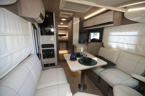 La présentation est également recherchée, tant à l’extérieure avec une esthétique et une décoration valorisante, qu’à l’intérieur avec une sellerie simili cuir claire du plus bel effet, et bien rembourrée, alliée à un mobilier mixant panneaux foncés satinés et éléments blanc laqué (portes de placards, cuisine…). Un lit de pavillon, disponible de série sur l’intégral et en option pour le profilé, complète l’ensemble.