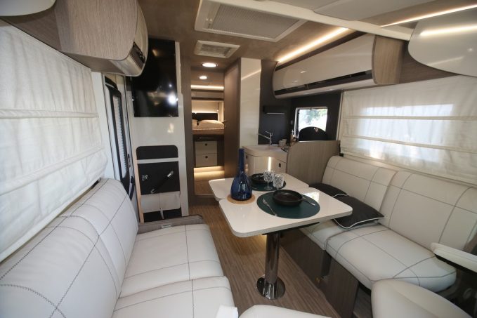 Ces deux véhicules de 7,47 mètres de long reposent sur Fiat Ducato ou Citroën Jumper en motorisation de 140 ch, et sont fabriqués dans l’usine SEA de Poggibonsi, à quelques encablures de Sienne, en Italie. Une attention toute particulière a été apporté aux matériaux, en particulier concernant leur poids (matières, process de fabrication, épaisseur de certains panneaux…) afin de garantir une belle charge utile (470 kg annoncés) malgré un équipement fourni (régulateur, clim », boucliers peints, sièges de cabine assortis (signés Agutti sur l’intégral), qui devient pléthorique grâce à un pack optionnel Ready To Go très complet (stores extérieur et occultants, jantes alliage, moustiquaire, panneau solaire, jantes alliage, lit de pavillon sur le profilé, chauffage combi C6 E…).