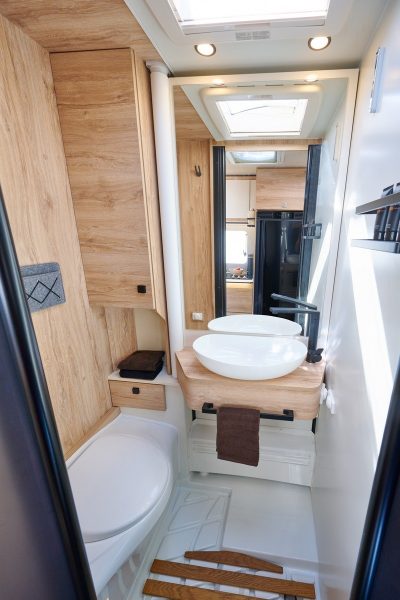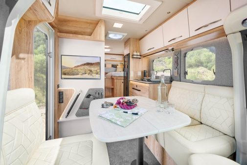 Au niveau de l'agencement, Eura Mobil propose dans l'habitacle un salon face/face composé d'une banquette et d'une assise individuelle positionnée en vis-à-vis, sans oublier évidemment les sièges pivotants du poste de conduite. Le coin repas profite d'une superbe luminosité grâce notamment au grand skyroof ouvrant logé dans la casquette de profilé. La cuisine offre un bel espace avec un réchaud mêlant induction et deux feux gaz. Fidèle aux autres modèles de la marque, les tiroirs sont larges et profonds. Ce Xtura 686 EF bénéficie en chambre arrière, de lits jumeaux de 80 x 195 cm chacun. Ils peuvent toutefois être réunis par un coussin additionnel central et former ainsi un grand couchage. Les sommiers sont perchés relativement haut dans le véhicule afin de conserver un grand volume en partie basse, dans la soute garage.