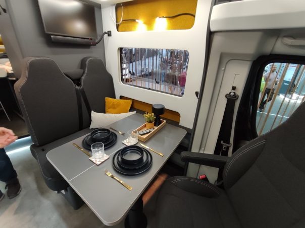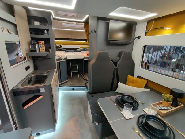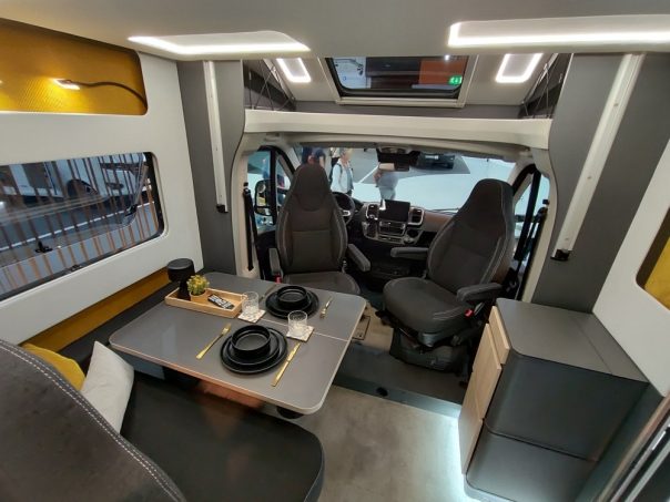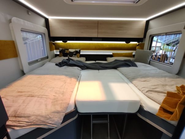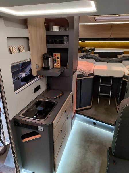 Par ce prototype, Frankia a décidé de miser sur l’espace à bord en abandonnant simplement tout placard de pavillon au niveau des parois au profit de niches. Au niveau du salon, le rangement latéral peut se désolidariser et se transformer en pouf pour une assise complémentaire. En cuisine, Frankia opte pour la Now-Tower qui comprend en partie basse le frigo à compression et en partie supérieure, un grand espace de rangement avec un rack coulissant accueillant la machine à café.