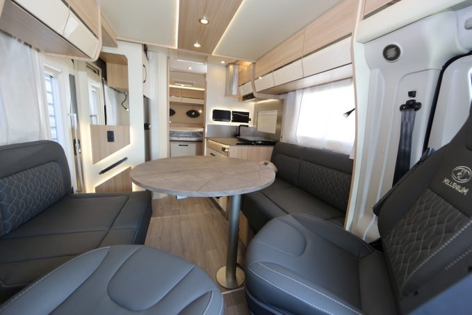 L’offre de profilés classiques Mayflower n’évolue pas. Ni celle des intégraux Wincester. En revanche, deux modèles de chacune de ces catégories sont présentés en version “Millenium”. Le ballon ovale est repris un peu partout : sur la carrosserie, mais aussi à l’intérieur où il sert de coussin, de motif de tête de lit et même de miroir. Pour honorer l’équipe de France, la marque a même repris le “coq vert”, logo des entrepreneurs de France engagés dans la transition écologique (une attitude à laquelle les dirigeants de Florium sont fortement attachés).